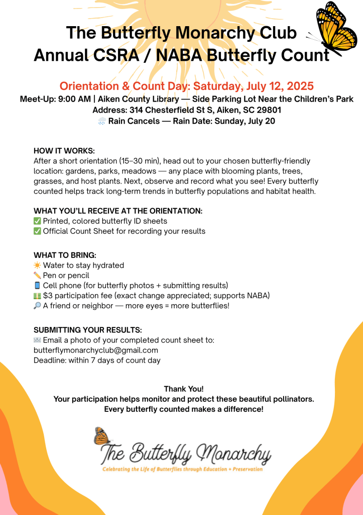 It’s time for The Butterfly Monarchy Club’s Annual CSRA / NABA Butterfly Count — part of a nationwide citizen science effort to track butterfly populations and their habitats.