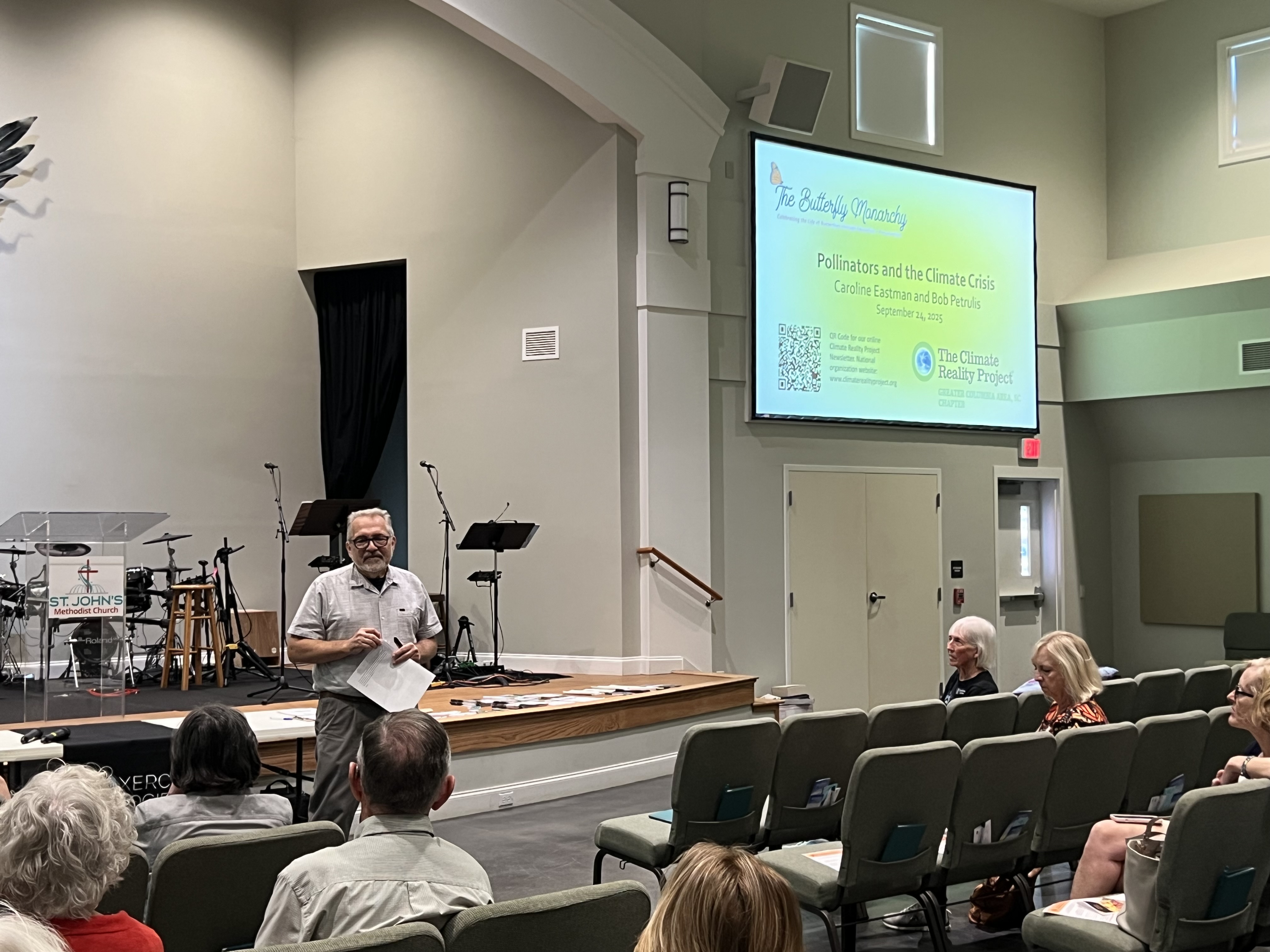 The Butterfly Monarchy Club marked Climate Week with a timely discussion about how a changing climate is reshaping the world of butterflies and pollinators. On Thursday members and guests gathered at St. John’s Methodist Church to hear from Dr. Caroline Eastman and Dr. Bob Petrulis, both active leaders in the Climate Reality Project. In addition, Dr. Eastman also serves as a Xerces Ambassador, bringing further expertise on pollinator conservation.
