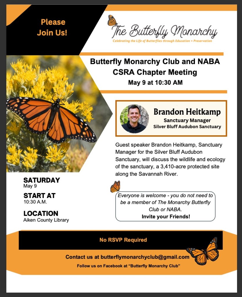 Please join us for our chapter meeting and guest presentation on May 9. We look forward to seeing everyone as we continue our work to preserve and protect butterfly habitats throughout our community.
