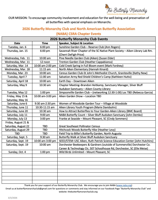 Thank you for your support of our Butterfly Monarchy Club. We encourage you to also join NABA (www.naba.org)